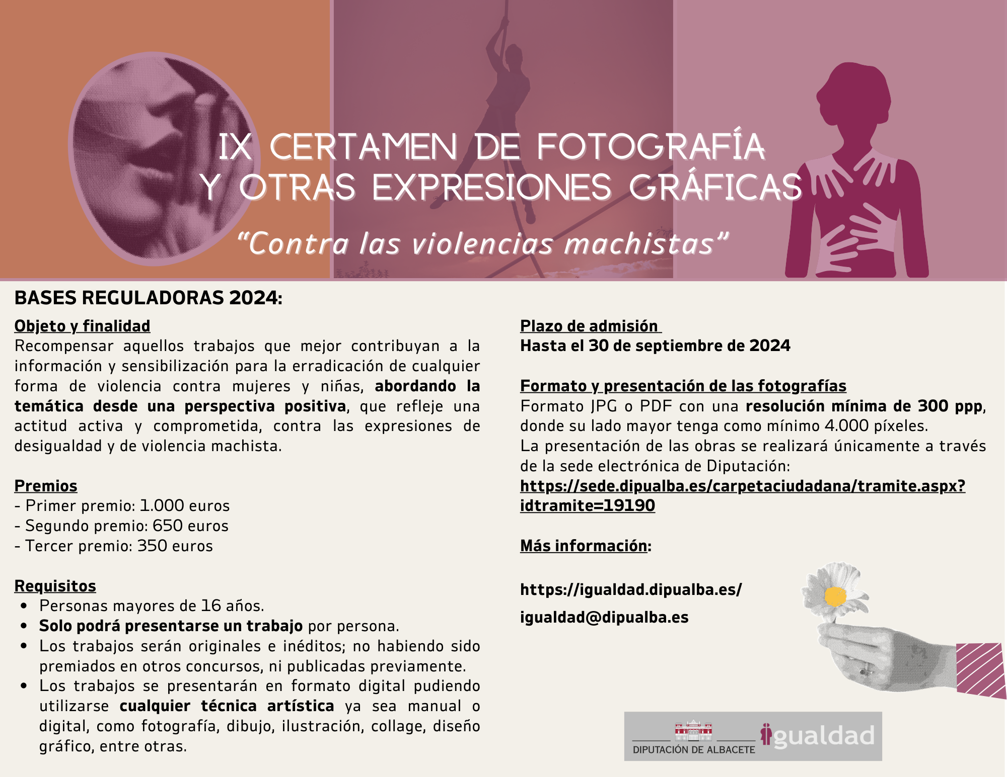 Se podrán presentar obras para cuya elaboración se hayan utilizado técnicas artísticas como fotografía, dibujo, ilustración, collage, diseño gráfico, entre otras. No podrán presentarse trabajos en formato audiovisual.